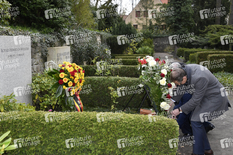 Ralf Wieland, Burkard Dregger und Michael Müller bei der Kranzniederlegung anlässlich des 100. Geburtstags des früheren Bundespräsidenten, Regierenden Bürgermeisters und Ehrenbürgers von Berlin, Richard von Weizsäcker an dessen Ehrengrab auf dem Waldfriedhof Dahlem. Berlin, 15.04.2020