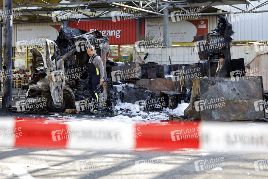Willi Herrens Reibekuchen-Foodtruck ist auf dem Parkplatz des Großmarkts Selgros abgebrannt. Die Feuerwehr untersucht das Wrack. Warum der Foodtruck abgebrannt ist, muss noch ermittelt werden. Willi Herren war am 20. April tot in seiner Wohnung in Köln gefunden worden. Den Foodtruck hatte er erst wenige Tage vor seinem Tod eröffnet. Frechen, 03.05.2021