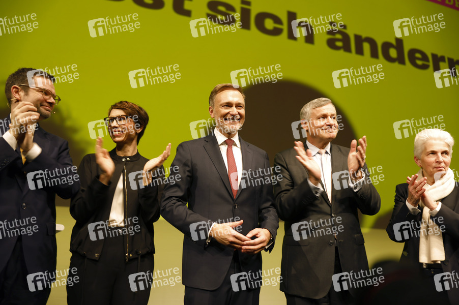 Marco Buschmann, Judith Skudelny, Christian Lindner, Hans-Ulrich Rülke und Marie-Agnes Strack-Zimmermann beim FDP Dreikönigstreffen 2025 im Stuttgarter Opernhaus. Stuttgart, 06.01.2025