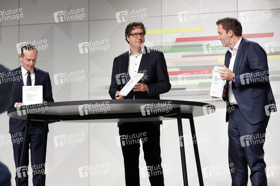 Volker Wissing, Michael Kellner und Lars Klingbeil beim Pressetermin zur Unterzeichnung des Koalitionsvertrages zwischen SPD, Bündnis 90/Die Grünen und FDP im Futurium. Berlin, 07.12.2021