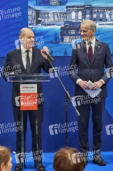 Deutsche Messe AG, Hannover Messe Industrie, Weltleitmesse der Industrie, Industriemesse, Industrieschau, Automatisierung, IT-Sicherheit, KI, Technologie, Wirtschaft, Ausstellung, Fair, Messe, Eröffnung, Opening, Leitmesse, Synergie und Kooperation, Wasserstoff & Brennstoffzellen, CO2-neutrale Produktion, Energizing a Sustainable Industry, Partnerland Norwegen, Bundeskanzler, SPD, Jonas Gahr Støre, Jonas Gahr Störe, Politiker, Ap, Ministerpräsident von Norwegen