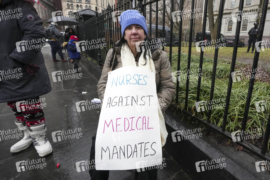 Über 300 Stadtarbeiter und andere protestieren mit einem Marsch über die Brooklyn Bridge, gegen die Ankündigung der Stadt, dass kommunale Angestellte ohne Covid-19-Impfung bis zum Ende der Woche entlassen würden. New York, 07.02.2022