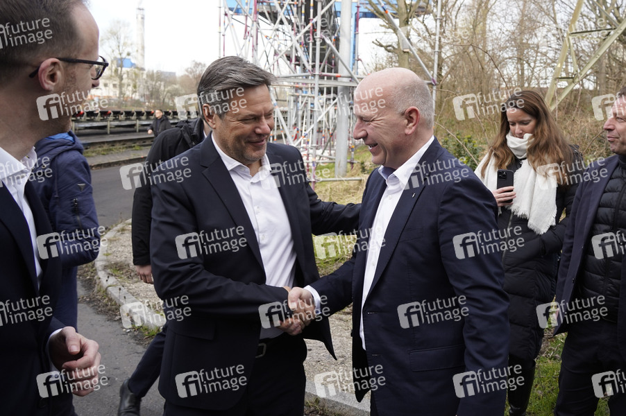 Christian Feuerherd, Robert Habeck und Kai Wegner bei der Grundsteinlegung einer Abwassergroßwärmepumpe von Vattenfall und Befüllen einer Zeitkapsel auf dem Kraftwerksgelände Reuter-West. Berlin, 12.03.2024