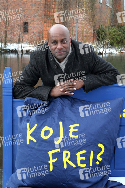 Yared Dibaba paddelt auf dem Schloßteich für die Aktion 'Koje frei?' um für Unterkünfte für Teinehmer der Kirchentags zu werben. Winsen an der Luhe, 13.03.2013