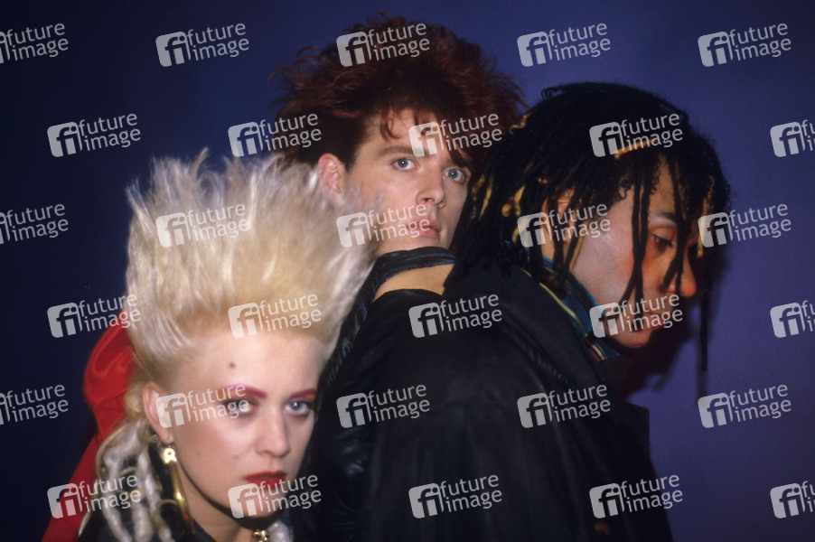 Alannah Currie, Tom Bailey und Joe Leeway on den Thompson Twins bei einem Photoshooting in einem Studio. London, 13.06.1985