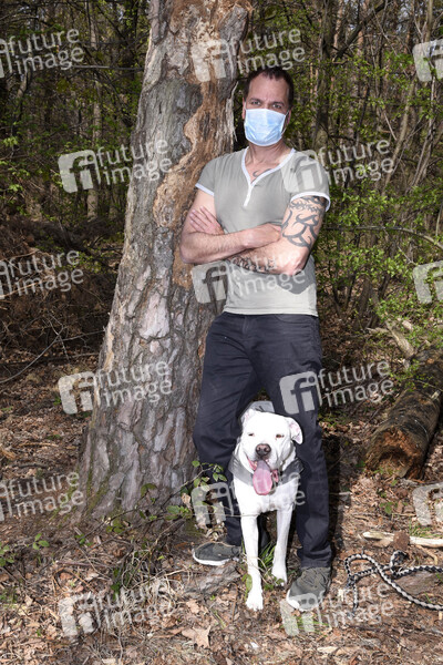 Dave Kaufmann mit seinem Hund Dean Martin bei einem exklusiven Fototerin während eines Spaziergangs. München, 17.04.2020