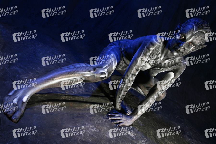 Bodypainting, Erotik, Frau, nackt, drinnen, weiblich, Monster, Außerirdische, Alien, Echse, Körperkunst, Kunst, Malerei, monochrom, erotic, woman, nude, indoor, female, monochrome, lizard, body art, body painting