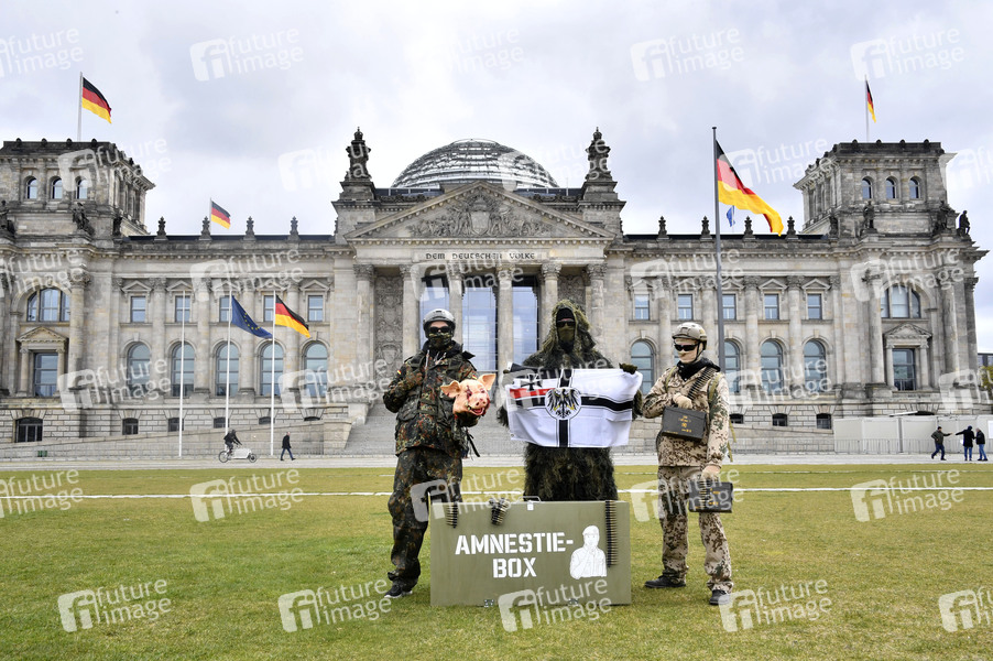 Protestaktion zur Sondersitzung des Verteidigungsausschusses des Bundestags zu den Vorfällen bei den Kommando Spezialkräften (KSK) der Bundeswehr vor dem Reichstagsgebäude. Bei der Aktion führen drei als KSK-Soldaten in voller Tarnmontur gekleidete Aktivisten vor der Kulisse des Bundestagsgebäudes die letzten Skandale der Bundeswehr-Einheit vor: Einer hält einen (künstlichen) blutverschmierten Schweinekopf in Händen, ein anderer zeigt rechtsextreme Symbolik und der dritte trägt Munitionskisten und Munition. Damit sollen die skandalträchtigen 'Partys' einiger KSK-Soldaten (bei denen reale Schweineköpfe verwendet wurden), die rechtsextremen Vorfälle in der Einheit sowie den Munitionsklau symbolisiert werden. Weiterhin wird ein Transparent mit der Aufschrift 'Kommando Spezialkräfte Auflösen' mit dem durchgestrichenen Wappen der Einheit gezeigt. Berlin, 12.04.2021