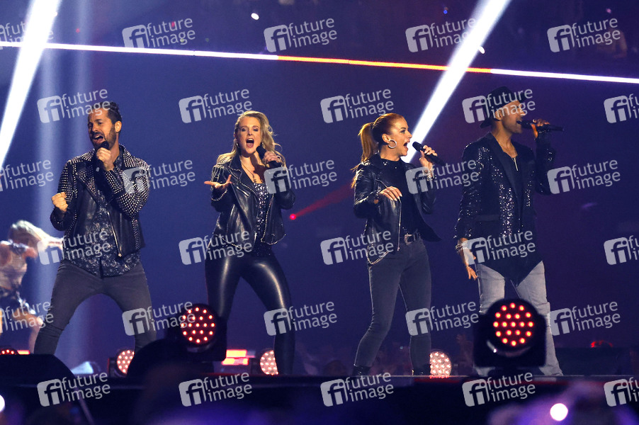 Konrad Wissmath, Chantal Jansen, Nastassja Giulia und Pat Lawson vom Ensemble Wahnsinn - Die Show in der TV Show 'Schlagerbooom 2025 - Alles funkelt! Alles glitzert!' in der Dortmunder Westfalenhalle. Dortmund, 18.10.2025