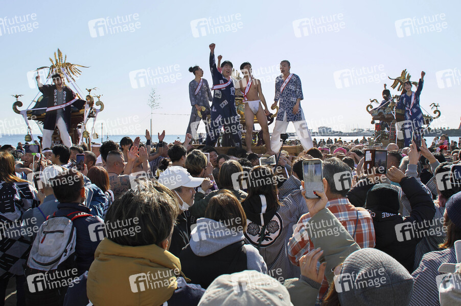 Teilnehmer auf einem tragbaren Schrein während einer Reinigungszeremonie am Strand Katase Higashihama. Fujisawa, 18.01.2026