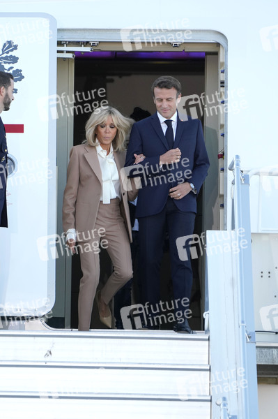 Emmanuel Macron mit Ehefrau Brigitte Macron bei der Ankunft zum G7-Gipfel am Flughafen München Franz Josef Strauß. München, 25.06.2022