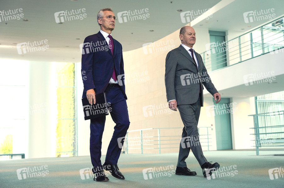 Jens Stoltenberg und Olaf Scholz beim Empfang des NATO-Generalsekretärs zu einem gemeinsamen Gespräch mit dem Bundeskanzler mit anschließendem Pressestatement im Bundeskanzleramt. Berlin, 26.04.2024