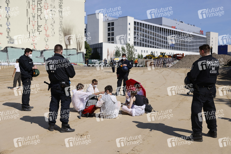 Klimaaktivisten besetzen A100-Baustelle. Aktivisten des Bündnisses Robin Wood demonstrieren mit der Aktion zusammen mit Aktivisten der Organisationen Ende Gelände, Fridays for Future und Sand im Getriebe gegen den geplanten Ausbau der Autobahn. Berlin, 05.06.2021