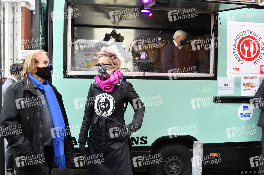 Frank Zander, Inka Bause und Bundespräsident Frank-Walter Steinmeier verteilen Essen und Geschenke aus dem Food Truck an Obdachlose und Bedürftige. Berlin, 16.12.2020