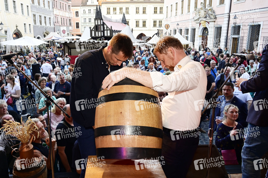 Florian Oest und Michael Kretschmer am Eröffnungstag vom Altstadtfest an der Altstadtbrücke. Görlitz, 29.08.2025