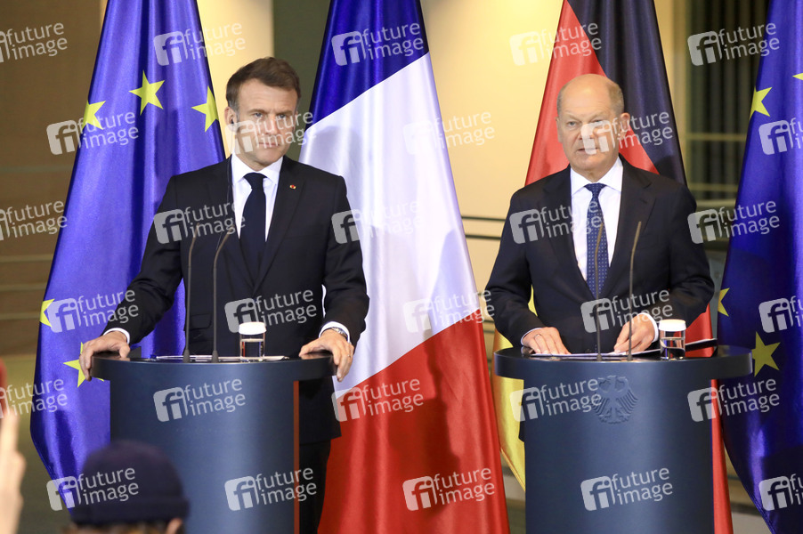Emmanuel Macron und Olaf Scholz beim Empfang des Staatspräsidenten der Französischen Republik zu einem gemeinsamen Gespräch mit anschließendem Pressestatement im Bundeskanzleramt. Berlin, 18.03.2025