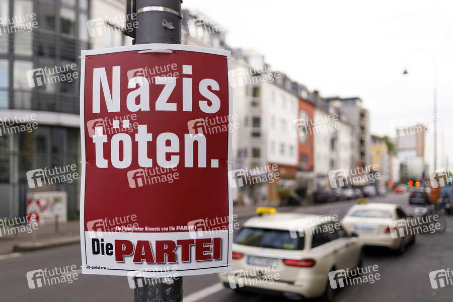 Ein Wahlplakat von Die Partei (Partei für Arbeit, Rechtsstaat, Tierschutz, Elitenförderung und basisdemokratische Initiative) für die Kommunalwahl 2020 in NRW mit der kontroversen Aufschrift 'Nazis töten'. Am 13. September 2020 werden in NRW Oberbürgermeister, Landräte, Stadträte und Kreistage neu gewählt. (Themenbild, Symbolbild) Köln, 09.09.2020