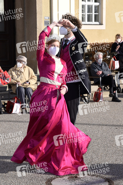 Das Prinzenpaar Berni I. (Berni Filser) und Margarethe I. (Margarethe Stadlbauer) bei der Aktion 'Fasching 2021 im Tascherl' vor dem Haus St. Josef (Münchenstift-Einrichtung). Um älteren Menschen, die in Zeiten der Pandemie besonders unter den Kontaktbeschränkungen leiden, ein bisschen Faschingsfreude ins Leben zu bringen, spenden der Verein 'Münchner für Münchner e.V.', die Josef und Luise Kraft-Stiftung und die Münchner Faschingsgesellschaft Narrhalla 3000 bunte Faschingstaschen für Münchner Senior*innen-Einrichtungen. München, 04.02.2021