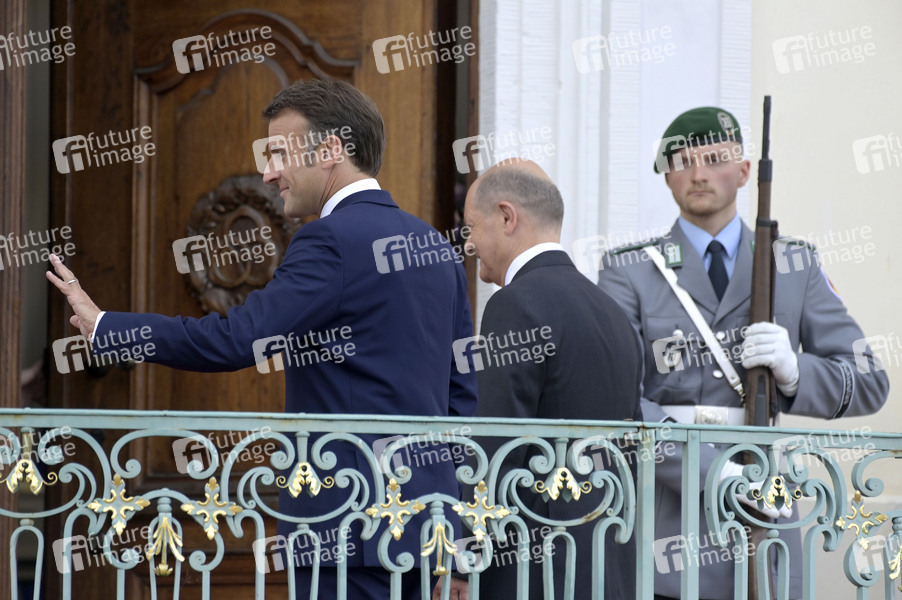 Emmanuel Macron und Olaf Scholz beim Treffen des Deutsch-Französischen Ministerrats im Gästehaus der Bundesregierung Schloss Meseberg. Meseberg, 28.05.2024