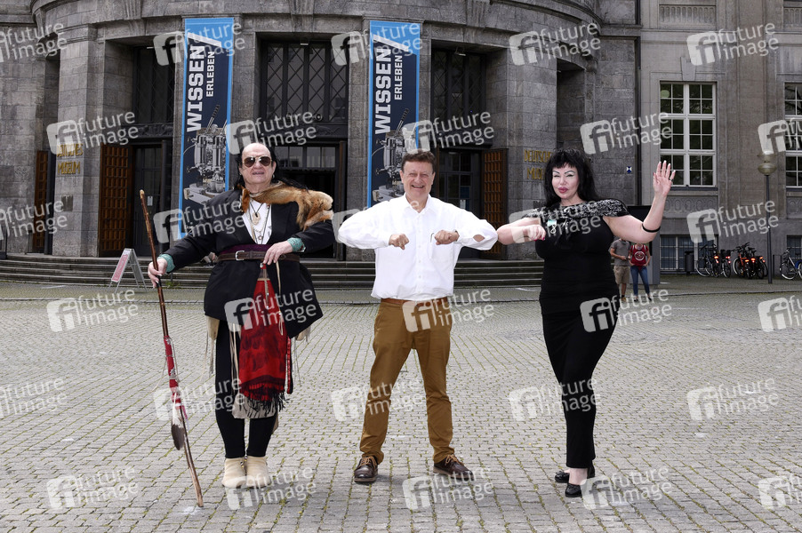 Willy Michl, Wolfgang Heckl und Cora Michl beim Pressetermin zum Konzert von Willy Michl zu seinem 70. Geburtstag im Rahmen des Eulenspiegel Flying Circus im Innenhof des Deutschen Museums. München, 02.07.2020