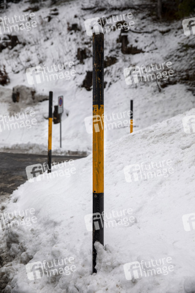 Holz, Verkehrsergänzungseinrichtung, Begrenzungspfahl, Abstand, Straße, Vereisung, Winter, Schnee, Gelb, Schwarz, Symbolbild, Symbolfoto, Frost, Kühl, Minusgrade, Schnee, Tiefschnee