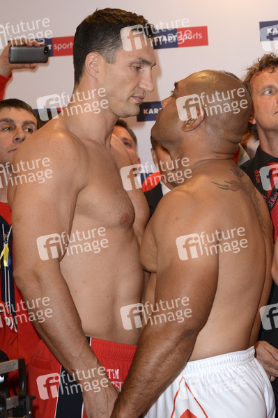 Wladimir Klitschko und Alex Leapai beim Einwiegen anlässlich des WM-Boxkampfs Wladimir Klitschko vs Alex Leapai in den Karstadt Arkaden vom Rhein-Ruhr Zentrum. Mülheim an der Ruhr, 25.04.2014