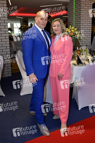 Claudia Pechstein mit Ehemann Matthias Große bei der Geburtstagsgala zum 80. Geburtstag von Dagmar Frederic im Restaurant am Müggelturm. Berlin, 15.04.2025