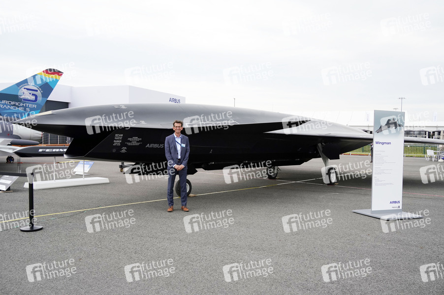 Peter Hunkel vor einer Wingman-Drohne von Airbus auf der ILA Berlin auf dem ILA-Gelände am Flughafen BER Berlin-Brandenburg. Berlin, 05.06.2024