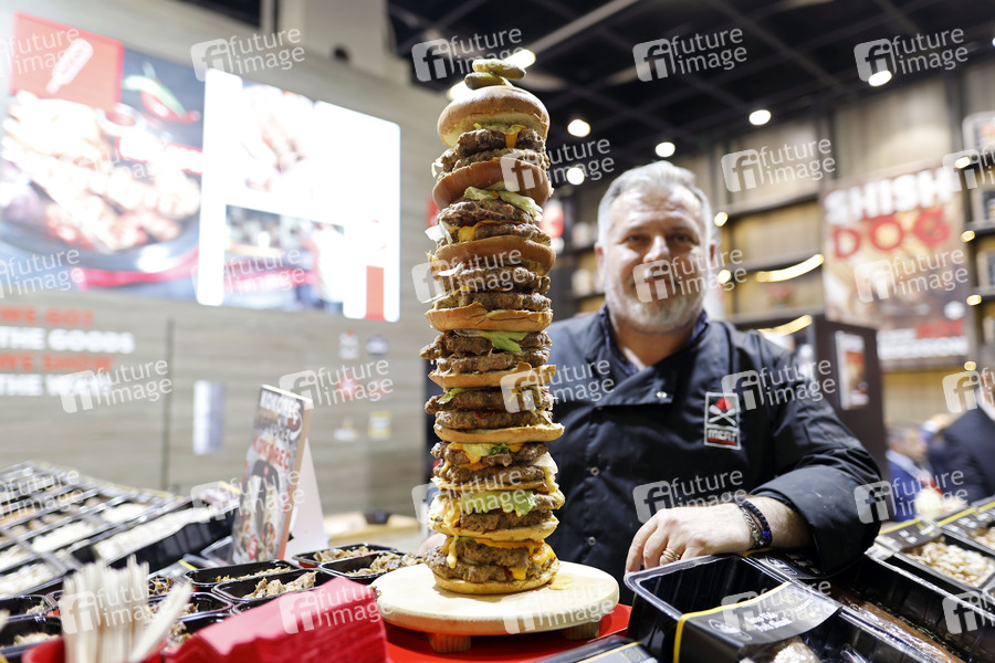 Burger, Riesen-Burger, Burgerfleisch, Rekord-Burger, Anuga, Food, Ernährung, Essen, Trinken, Nahrung, Nahrungsmittel, Food-Messe, Lebensmittel-Messe, Lebensmittelmesse, FoodTech, Fachmesse, Innovationen, Nachhaltigkeit, pflanzliche Lebensmittel, Food-Trends, Laborfleisch, Flexitarismus, Tierwohl, neue Produkte, Anuga-Logo, Fahnen, Anuga-Fahnen, Symbolfoto, Symbolbild