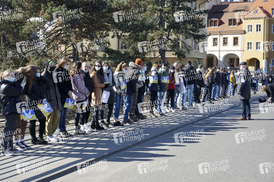 Initiiert vom Görlitzer Augustum-Annen-Gymnasium fanden sich ca. 1.000 Menschen zu einer grenzüberschreitenden Menschen-Kette zusammen, ausgehend von der Altstadtbrücke in beide Richtungen nach Zgorzelec und Görlitz. Mit dabei waren der Görlitzer Oberbürgermeister Octavian Ursu, sein Zgorzelecer Amtskollege Rafal Gronicz und Marcin Król, der Konsul der Republik Polen in Berlin. Görlitz, 09.03.2022