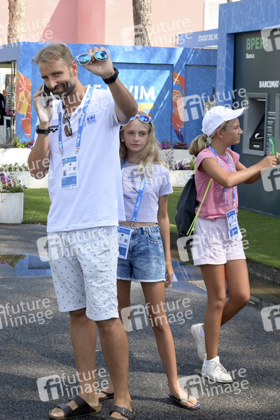 Massimiliano Rosolino mit Töchtern Sofia Nicole und VIttoria Sidney bei der European Aquatics Championship 2022 im Foro Italico. Rom, 13.08.2022