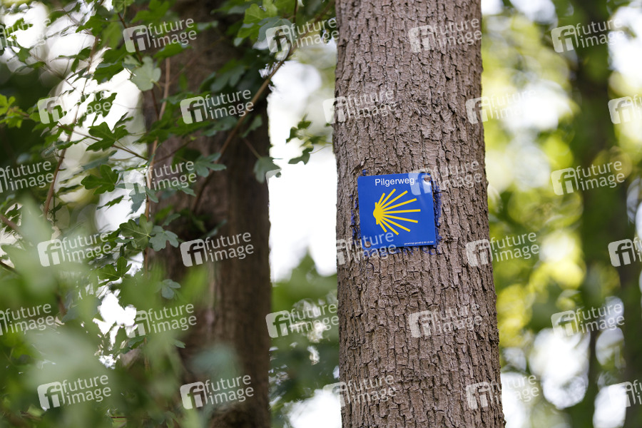 Ein Hinweisschild Pilgerweg an einem Baum im Grüngürtel. Köln, 05.05.2020