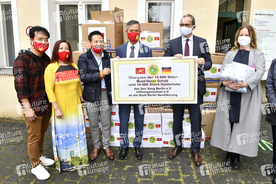 Nguyen Thanh Tung, Duong Thi Bich Ngoc, Tran Manh Hung, Nguyen Minh Vu, Michael Müller und Claudia Hering bei der Entgegennahme der Spende von Masken und Handschuhen des vietnamesischen Wohltätigkeitsvereins Hoi tu thien Sen Vang Berlin in Pankow. Berlin, 25.05.2020