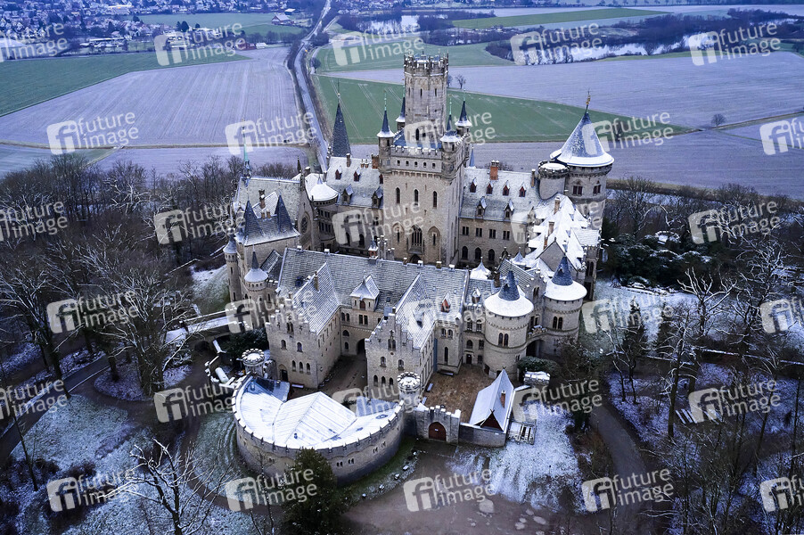 Luftaufnahme, offizieller Wohnsitz der Prinzen von Hannover, Welfen, Bauzeit 1857-1867, Ernst August von Hannover, Neugotik, Architekt: Conrad Wilhelm Hase, Pattensen, Winter, Schnee