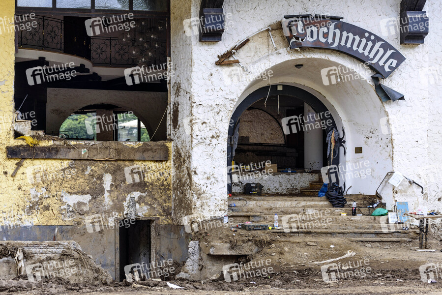 Nach dem Jahrhunderthochwasser in der Eifel durch heftige Regenfälle und Dauerregen mit Überschwemmungen und Überflutungen haben die Aufräumarbeiten im Ahrtal große Fortschritte gemacht. Einheiten von Polizei, THW, Bundeswehr und Feuerwehr mitsamt vielen freiwilligen Helfern haben Straßen geräumt, Schutt und Schlamm entfernt und die Menschen versorgt. Der Wiederaufbau wird trotzdem Jahre dauern. Im Bild Flutschäden in der Ortschaft Mayschoß, in der die Flut viele Häuser zerstörte, 08.08.2021