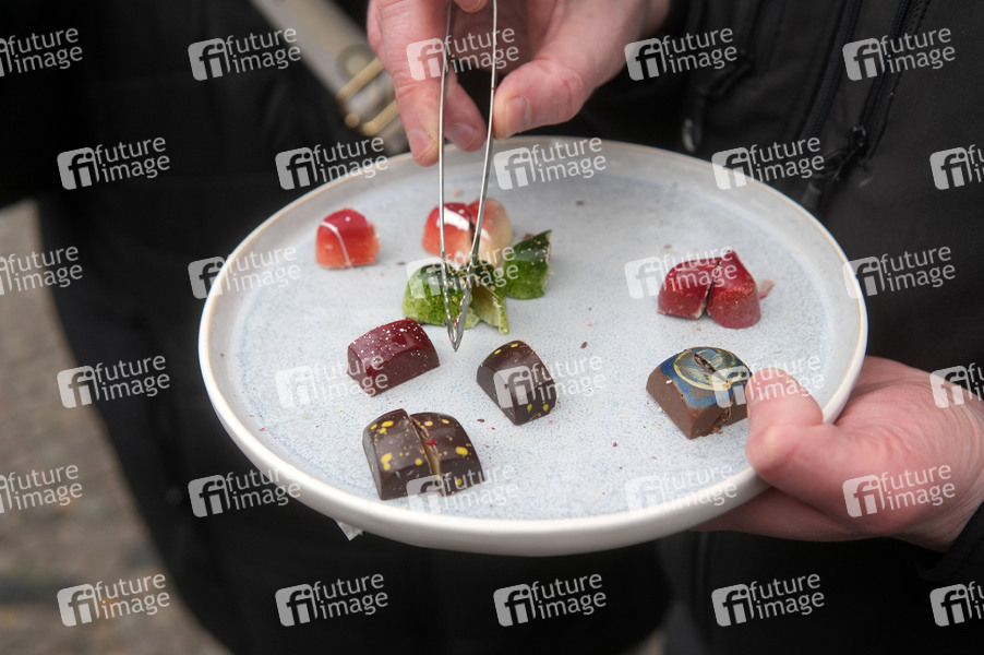 Kunstvoll handgefertigte Pralinen. Das Gelbe vom Ei - kunsthandwerklicher Ostermarkt auf dem Karl-August-Platz in Charlottenburg (Symbolfoto, Themenfoto). Berlin, 24.03.2024