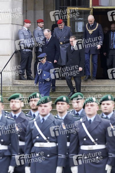 Stephan Weil, Boris Pistorius und Belit Onay beim Feierlichen Gelöbnis zum Gründungstag der Bundeswehr auf dem Platz der Menschenrechte vor dem Neuen Rathaus. Hannover, 12.11.2024