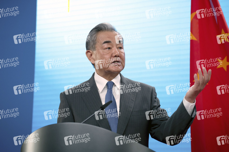 Wang Yi bei einer gemeinsamen Pressekonferenz des chinesischen Außenministers und des deutschen Außenministers im Auswärtigen Amt. Berlin, 03.07.2025