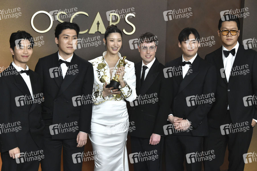 Lee Yu-han, Teddy Park, Ejae, Mark Sonnenblick, Nam Hee-dong und Seo Jeong-hoon mit dem Oscar für den besten Filmsong 'Golden' aus 'KPop Demon Hunters' beim Preisträger-Photocall der Oscar Verleihung 2026 / 98th Annual Academy Awards im Dolby Theatre. Los Angeles, 15.03.2026
