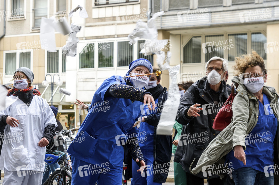 Zum Tag der Pflege protestiert das Aktionsbündnis 'Gesundheit ohne Profite' unter dem Motto 'Die Pflege schnappt nach Luft' vor dem Bundesministerium für Gesundheit in Berlin. Damit wollen sie auf die außerordentliche Belastung von Pflegenden in der Corona-Krise hinweisen. Ihre Forderungen haben sie auf Toilettenpapierrollen verewigt. Berlin, 12.05.2020