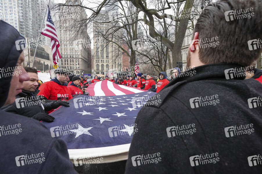 Über 300 Stadtarbeiter und andere protestieren mit einem Marsch über die Brooklyn Bridge, gegen die Ankündigung der Stadt, dass kommunale Angestellte ohne Covid-19-Impfung bis zum Ende der Woche entlassen würden. New York, 07.02.2022