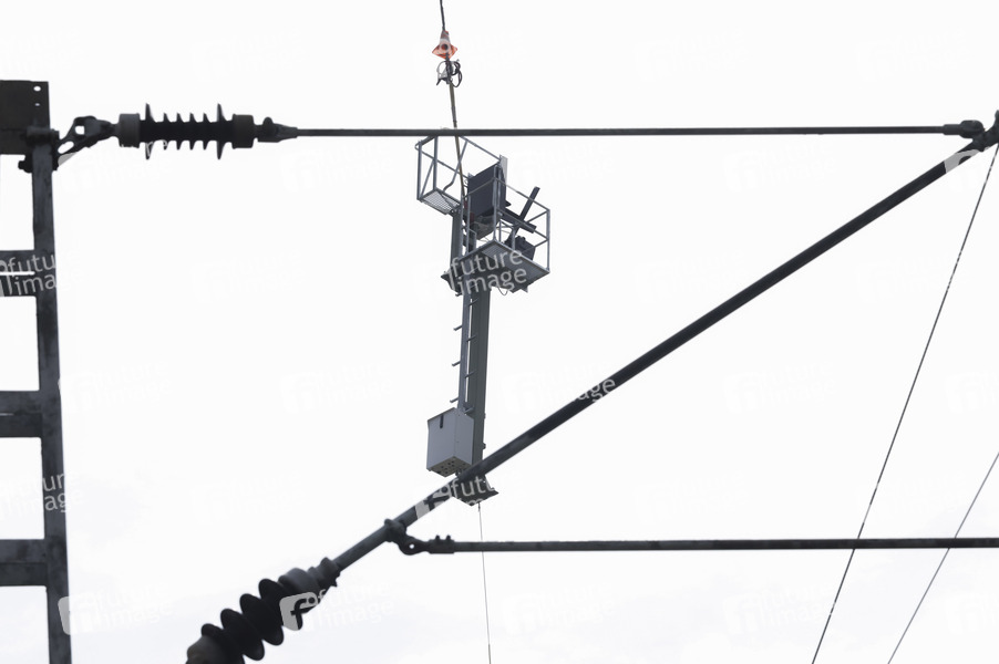 Hauptsignal am Heleikopterhaken beim Fototermin 'Helikopter fliegt Signalmaste für das neue Elektronische Stellwerk in Bonn-Beuel ein'. Es beginnt letzte große Bauphase vor der Generalsanierung der rechten Rheinstrecke im Jahr 2026. Mit Hilfe eines Helikopters werden knapp 50 Signalmaste für das neue ESTW Bonn-Beuel eingeflogen. Bonn, 14.06.2025
