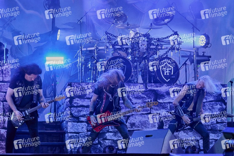 Pontus Norgren, Fredrik Larsson und Oscar Dronjak von Hammerfall live auf dem Riverside Festival Aarburg in der Riverside Arena. Aarburg, 22.08.2025