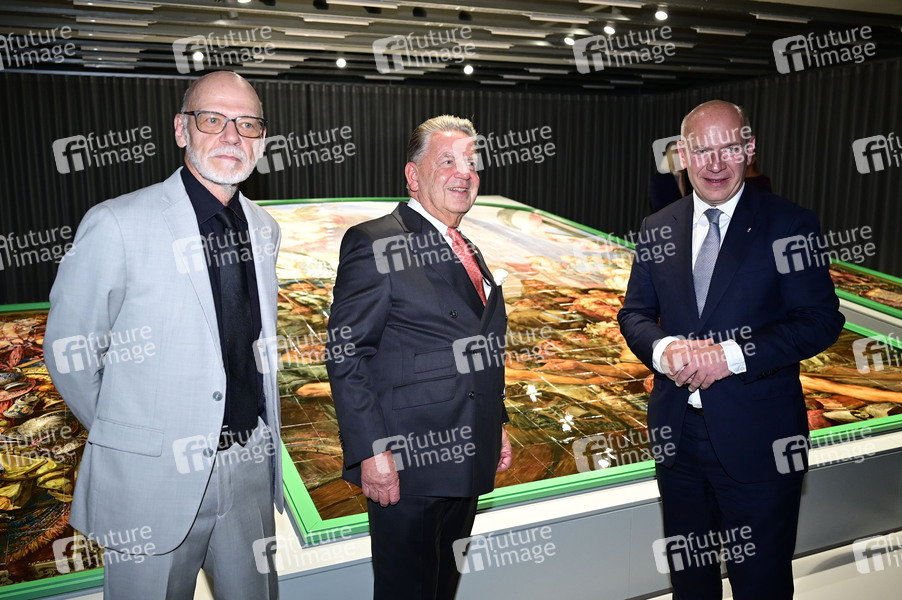 Reinhard Andress, Kai Wegner und Jörg Woltmann beim Flying Dinner zum 261. Geburtstag der Königlichen Porzellan-Manufaktur Berlin sowie der Enthüllung des vollständig, restaurierten Fliesenwandgemäldes 'Glory of Germania' in der Ringkammerofenhalle auf dem Manufakturgelände. Berlin, 20.09.2024