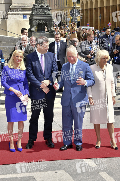 Karin Söder, Markus Söder, Prinz Charles und Herzogin Camilla von Cornwall bei der Begrüßung der britischen Royals auf dem Max-Joseph-Platz vor der Residenz München. München, 09.05.2019