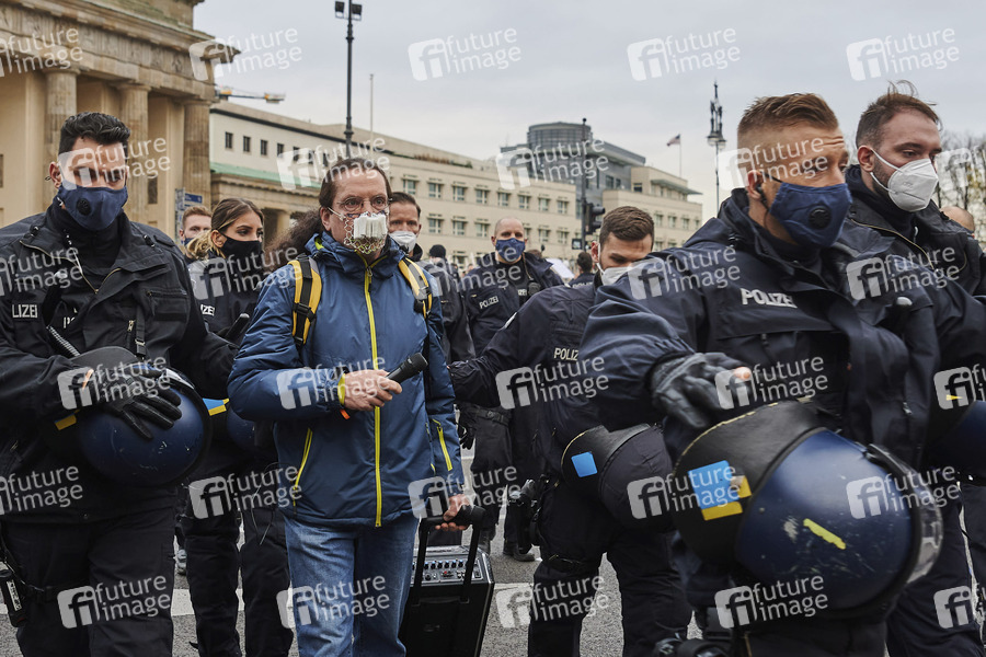 Tausende Demonstranten protestieren am Brandenburger Tor und im Regierungsviertel gegen die Corona-Politik der Regierung anlässlich der Bundestagsitzung zum Infektionsschutzgesetz. Die Polizei löst den Protest auf. Dabei kommt es zu Festnahmen, dem Einsatz von Wasserwerfern und Verstößen gegen die Maskenpflicht. Proteste in unmittelbarer Nähe des Bundestags waren zuvor untersagt worden. Berlin, 18.11.2020