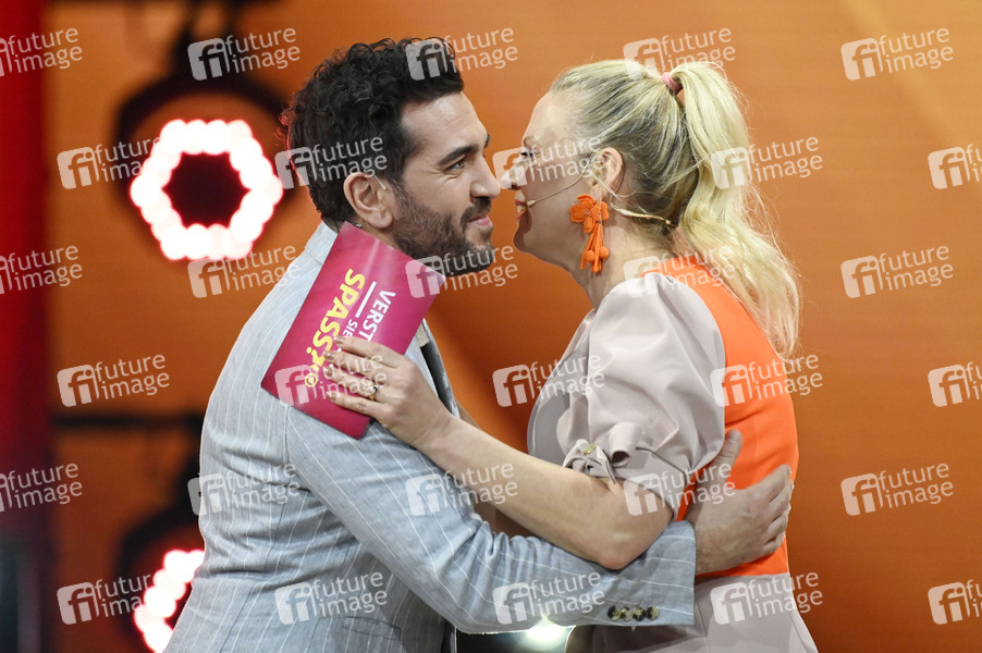 Elyas M'Barek und Barbara Schöneberger bei der Aufzeichnung der ARD-Unterhaltungsshow 'Verstehen Sie Spass?' im Studio H in Berlin-Adlershof. Berlin, 31.03.2022