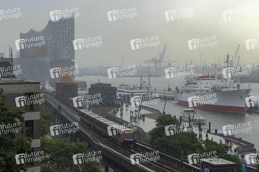Starke Regenfälle und Gewitter sorgen diesen Sommer vermehrt für Unwetterwarnung: Elbphilharmonie, Museumsschiff Cap San Diego und U-Bahn der Linie U3 im Regen an den Landungsbrücken im Hafen. Hamburg, 14.08.2024