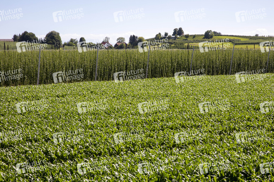 Hopfenstauden und Maisanbau am Hopfenpfad beim Fototermin am Hopfengut No20. Tettnang, 07.07.2020