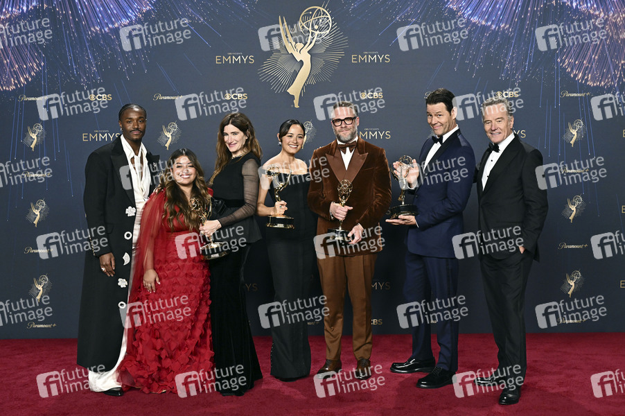 Dewayne Perkins, Keyla Monterroso Mejia, Kathryn Hahn, Chase Sui Wonders, Seth Rogen, Ike Barinholtz und Bryan Cranston mit den Emmy für die Comedy-Serie 'The Studio' beim Preisträger-Photocall der 77. Primetime Emmy Awards 2025 im Peacock Theater. Los Angeles, 14.09.2025